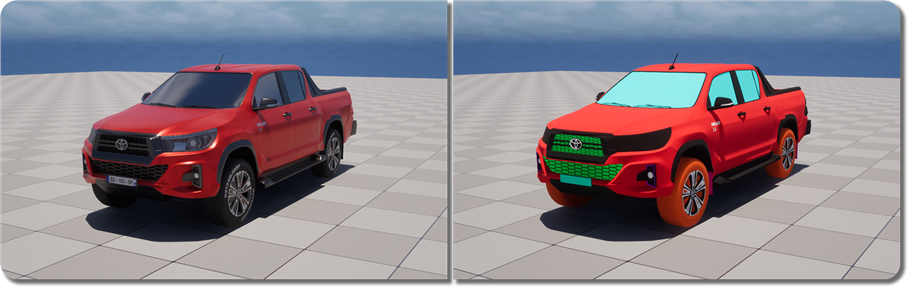 To make this possible, we gave Falcon’s Capture Sensor the ability to read the UV image of any digital twin. Falcon users can leverage this functionality by creating a special segmentation texture that uses the same UV coordinates that a twin’s mesh uses at runtime. Going back to the simple example of a vehicle, the license plate can now be segmented separately, using its own color, even if it’s not a standalone mesh. For more complex, detailed assets, multiple colors can be used to encode dozens of fine-grained components.